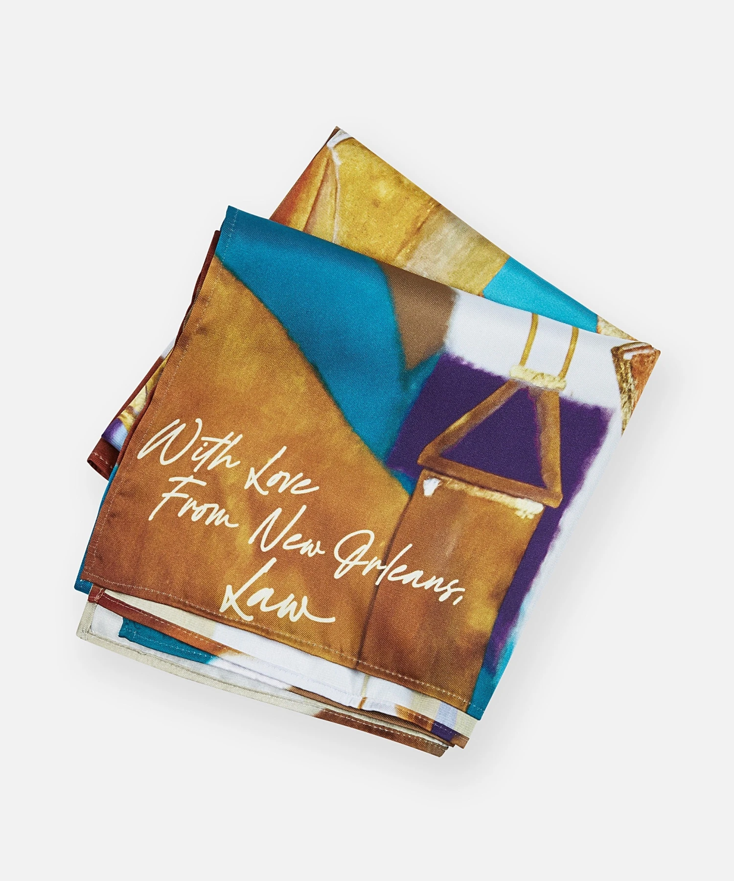This beautiful printed bandana is a colorful work of art. It features digital printed art imbued with the spirit of New Orleans, signed off with a love note from the city, to be worn as you see fit.